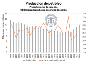 Por su parte, la producción de gas creció un 2% en el primer trimestre del año, marcando su nivel más alto desde 2009 para este período. Para el gas también se marca el cuarto año consecutivo de crecimiento sostenido en la producción.