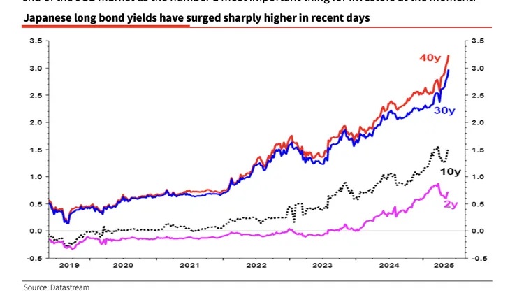 Sucede que los rendimientos de los bonos globales, en particular en el extremo largo de la curva, treparon con fuerza en todo el mundo en las últimas semanas ante la creciente preocupación por los déficits fiscales. En el caso de Japón, los títulos del gobierno y emitidos por un país altamente endeudado, son el “canario en la mina de ‘duration’ global”, escribieron los analistas de Goldman Sachs la semana pasada tras una débil demanda en una subasta de bonos a 20 años.
