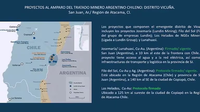 Los principales proyectos de cobre y algunos de los de litio son muy cercanos a la frontera con Chile. En 1999 los entonces presidentes Carlos Menem y Eduardo Frei, sus cancilleres (Guido di Tella y Gabriel Valdés) y ministros de Economía (Domingo Cavallo y Eduardo Aninat) firmaron el Tratado Binacional Minero que se mantiene vigente, con encuentros semestrales de las “Comisiones Técnicas” de ambos países y ayuda a viabilizar cualquier proyecto a lo largo de los 5.300 kilómetros de frontera argentino-chilena, la tercera más larga del mundo, después de las que median entre EEUU y Canadá y entre Rusia y Kazakstán.