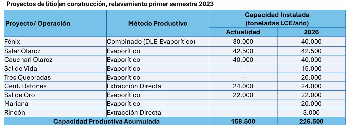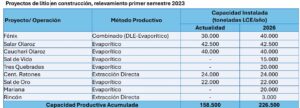 Proyectos de litio en construcción, relevamiento primer semestre 202