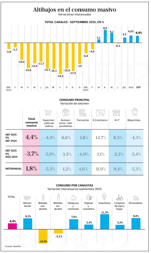 o.- (Paula Urien) El consumo masivo siguió mostrando en septiembre señales dispares: con alzas en la comparación interanual, los datos reflejan fuertes caídas respecto de agosto de este año. Según los cálculos de la consultora Scentia, hubo una variación positiva del 4,4% en consumo total respecto de septiembre de 2024. Sin embargo, en su variación intermensual, se registraron caídas en prácticamente todos los rubros. Solo se salvó, y por poco, el e-commerce. La medición de Scentia incluye supermercados de cadena, autoservicios independientes, kioscos y negocios tradicionales y farmacias.