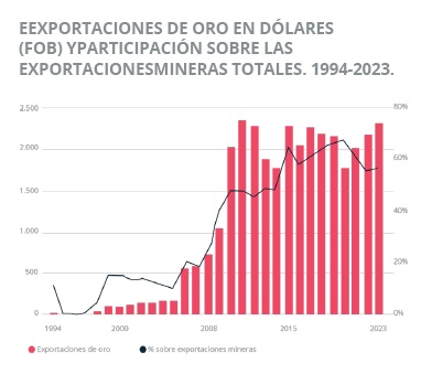 EXPORTACIONES DE ORO EN DÓLARES (FOB) Y PARTICIPACIÓN SOBRE LAS EXPORTACIONESMINERAS TOTALES. 1994-2023.