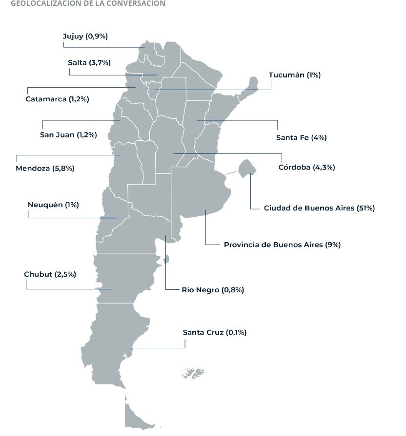 En contraste, en Jujuy y Catamarca se mantienen activos los reclamos de comunidades indígenas y organizaciones locales, con foco en el acceso al agua, el respeto a derechos territoriales y el impacto ambiental. La creciente centralidad de los oficialismos provinciales en la conversación (37 %) da cuenta de su rol como promotores del sector.