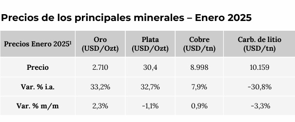 “En cuanto a los precios de los principales minerales: oro, plata, cobre y litio se agrega en el informe fechado en febrero del mismo año, que -en el primer mes de enero de 2025:
