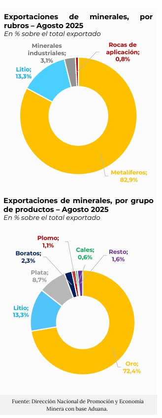 Separando por rubros, para el mes de agosto de 2025 las ventas al exterior de minerales metalíferos alcanzaron el 82,9% de las exportaciones mineras (u$s 352 M), teniendo una disminución interanual de 29,9%.