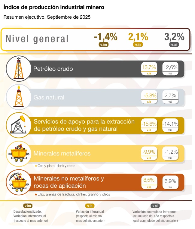 En septiembre de 2025, el índice de “Extracción de petróleo crudo y gas natural y servicios de apoyo para la extracción de petróleo crudo y gas natural” muestra una suba de 2,3% respecto a igual mes de 2024. El acumulado enero-septiembre de 2025 presenta un aumento de 3,2% respecto a igual acumulado del año anterior.