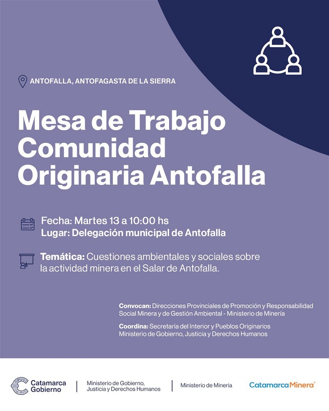 o.- Las Direcciones Provinciales de Promoción y Responsabilidad Social Minera y Gestión Ambiental Minera, del Ministerio de Minería, convocaron a la comunidad originaria de Antofalla para abordar las temáticas ambientales y sociales sobre la actividad minera que se está llevando a cabo en el Salar de Antofalla. El propósito es articular y acordar entre todos los actores para abordar las problemáticas en conjunto.