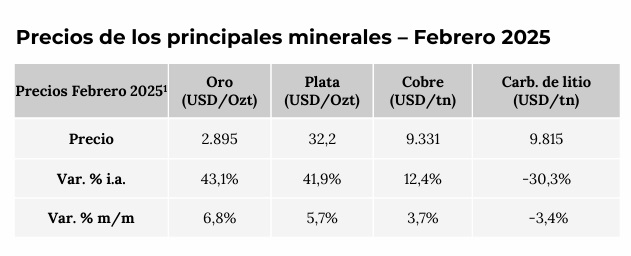 o.- Según el informe de la Dirección Nacional de Promoción y Economía Minera, Subsecretaría de Desarrollo Minero dependiente de la Secretaría de Minería del Ministerio de Economía de la Nación, los precios de los principales minerales durante el mes de febrero de 2025 fueron: oro, con un 6,8% de aumento respecto a enero y un 43,1% en términos interanuales promedió los los 2.895USD/Ozt (siendo febrero, el mes en que el precio del oro alcanzó un nuevo máximo histórico).
