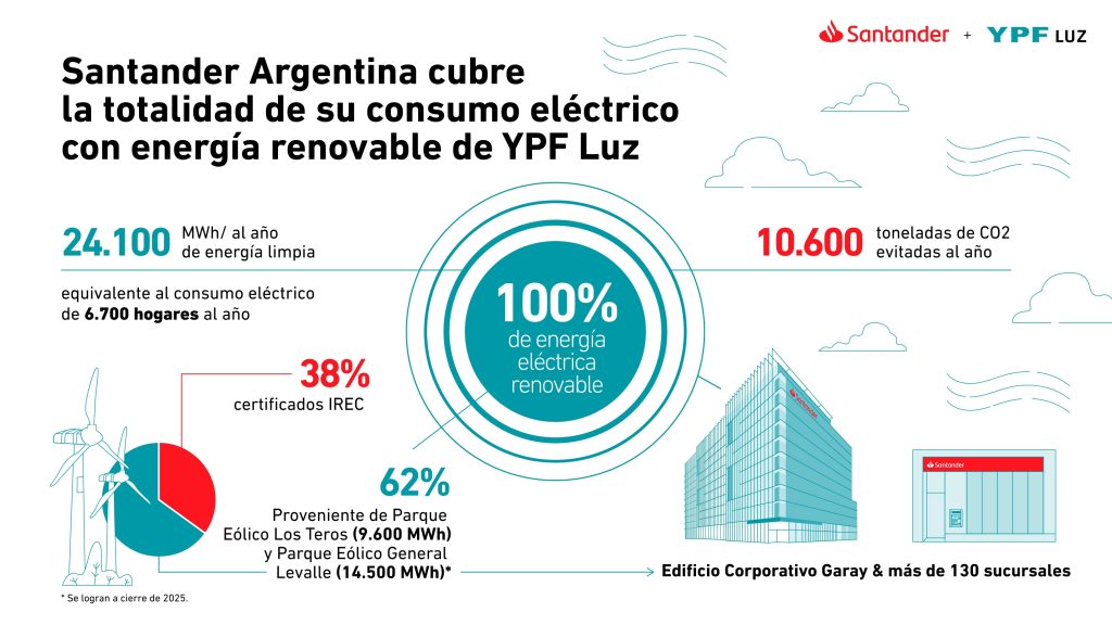 “Esta alianza con YPF Luz, no solo nos permite lograr que nuestro consumo eléctrico provenga de fuentes renovables, sino que también representa la oportunidad de ayudar a nuestros clientes en su transición hacia una economía baja en carbono”, afirmó Germán Hammoe, Head de Estrategia y Finanzas de Santander Argentina. (El Pregón Energético)